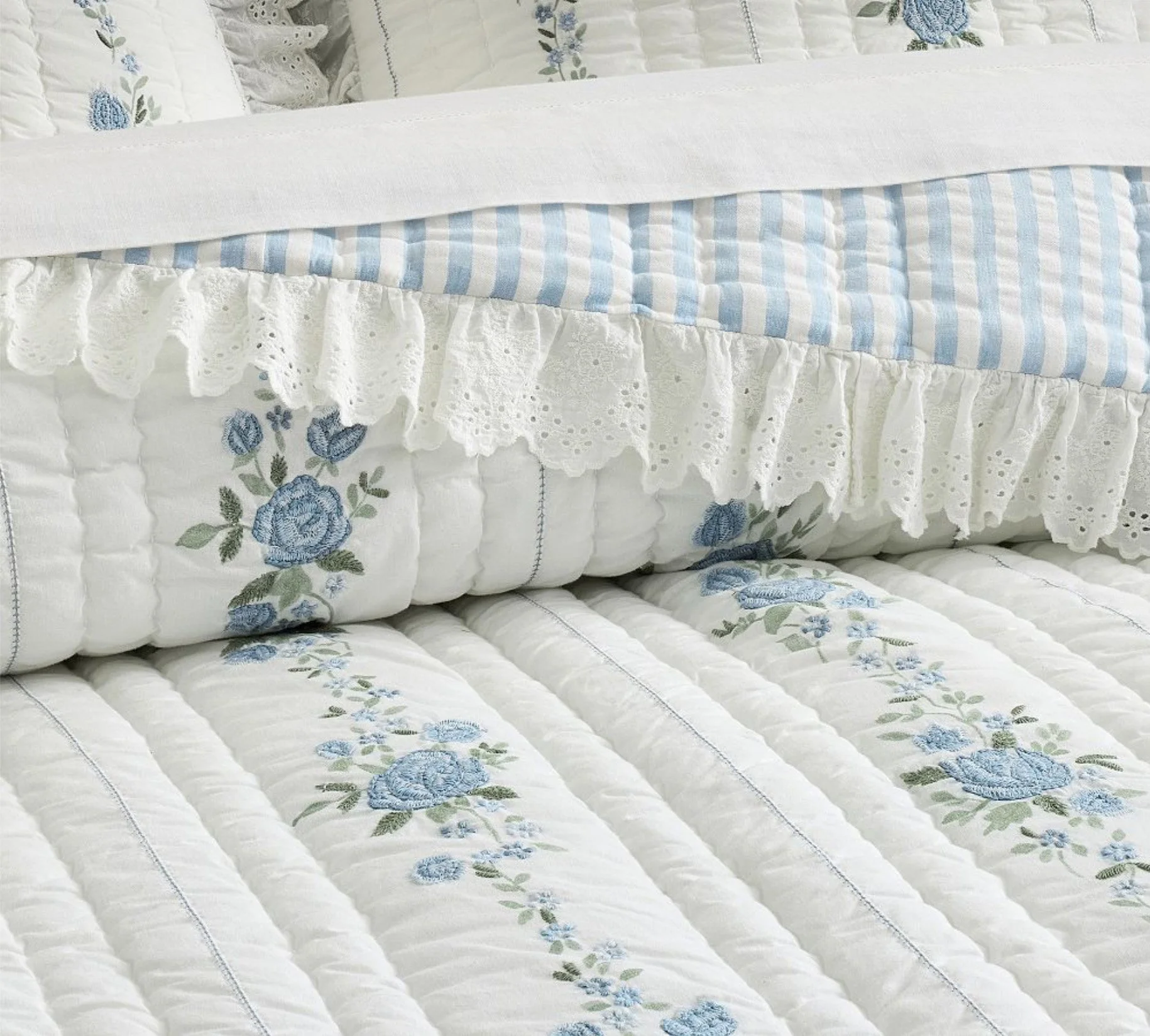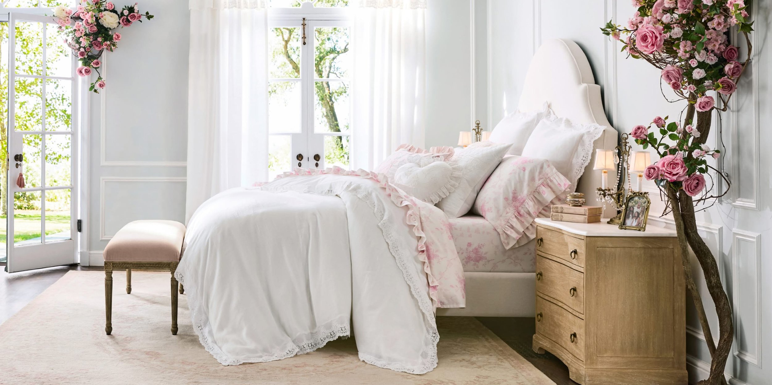 The LoveShackFancy x Pottery Barn collaboration translated the brand’s romantic, vintage-driven DNA into a multi-category home and outdoor assortment. Inspired by archival prints and runway collections, the project required careful print engineering, substrate versatility, and cohesive color integration across textiles, furniture, and performance outdoor materials.