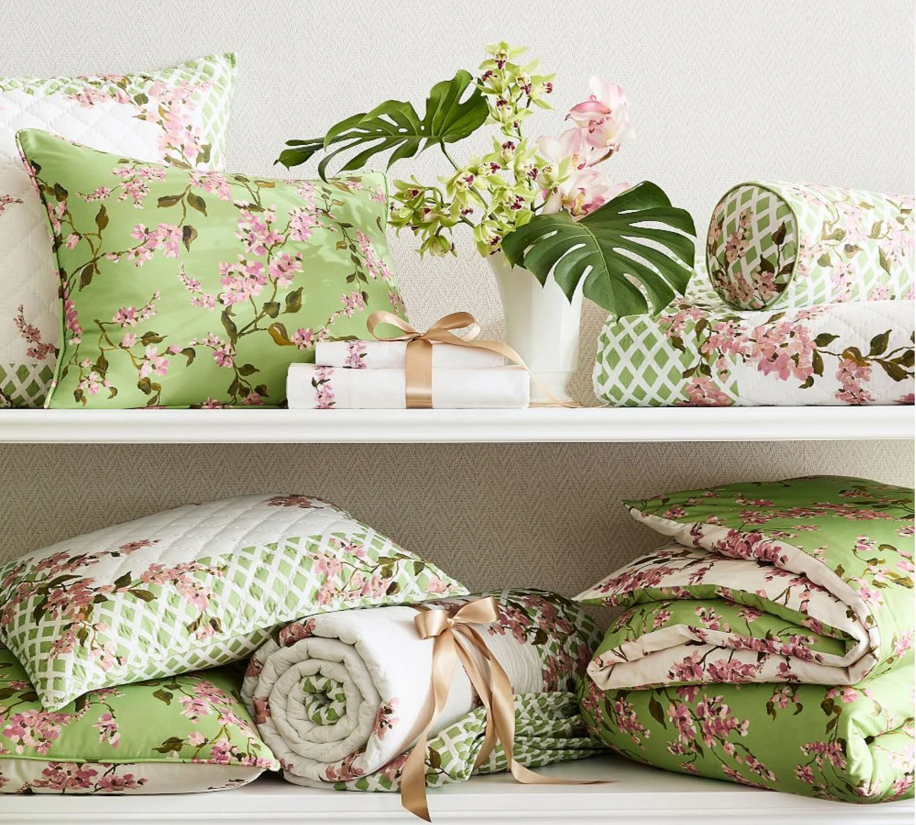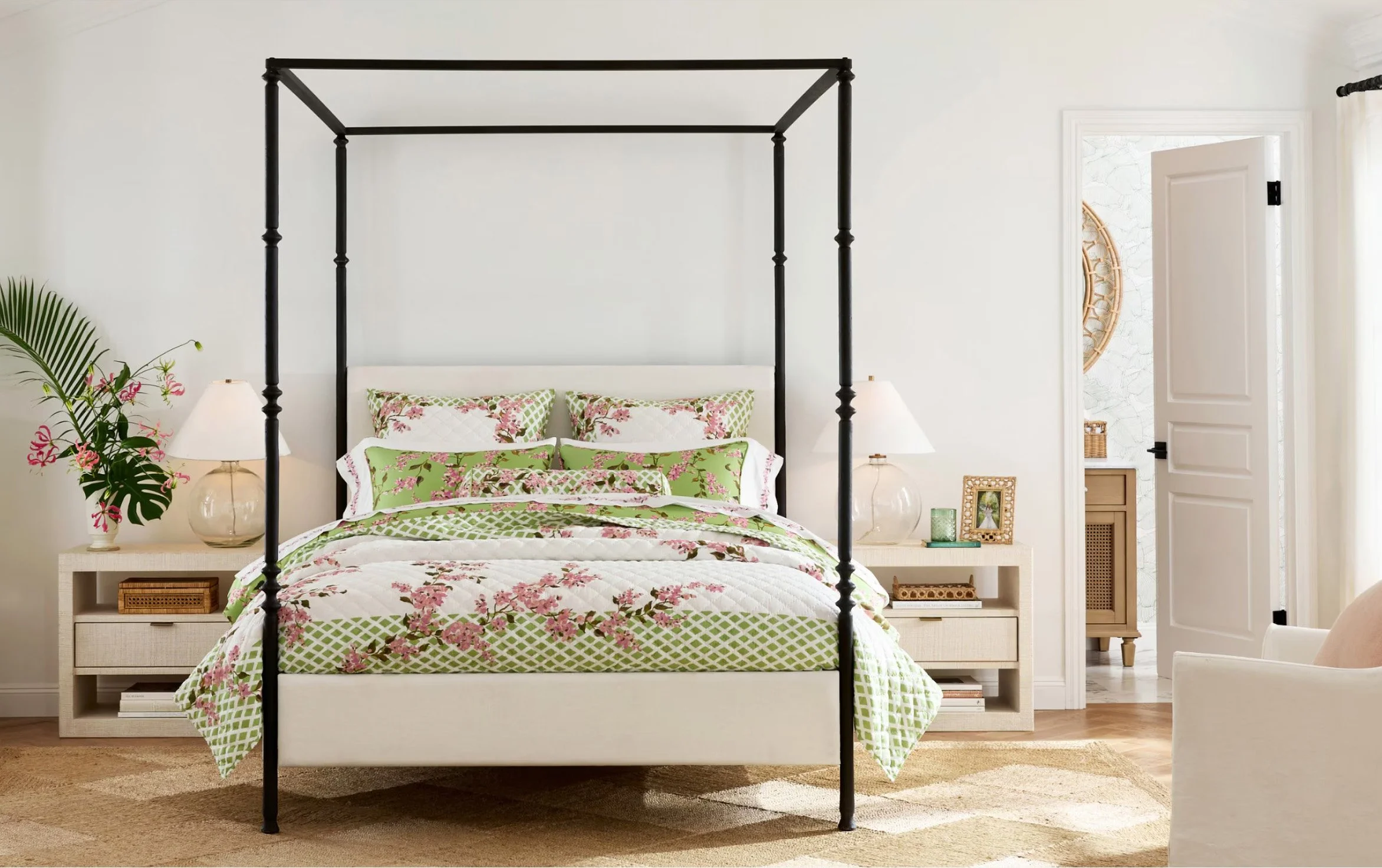 The Spring 2026 Monique Lhuillier collaboration began with a singular inspiration: one of her signature floral dresses, celebrated for its romantic color and expressive print. The collection brings Monique’s feminine and elegant style into the home, layering florals across bedding, tabletop, decorative textiles, and select furniture silhouettes.